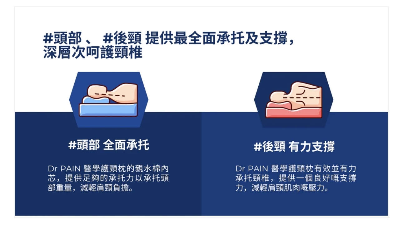 Dr PAIN 護頸枕 Pro 採用了高彈性記憶棉和人體工學設計的枕頭,可以根據你的頸部和頭部的形狀來提供最佳的支撐和舒適度。頸椎枕還有防止過度彎曲頸椎的功能,有助於維持脊椎的健康狀態。護頸枕頭主要功能是支撐及承托頸椎和頭部,提供足夠的承托力以承托頭部重量,並減少肩頸肌肉的壓力負擔!Dr PAIN 醫學護頸枕頭為你帶來更優質的睡眠,更健康的脊椎及頸椎